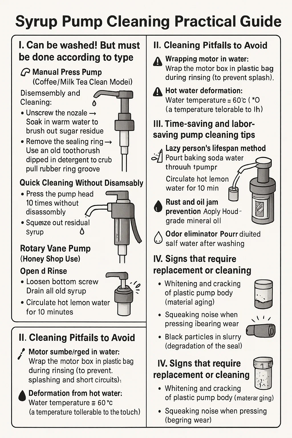 بالنسبة لبقع السكر العنيدة، استخدمي مجفف الشعر لتسخينه ثم تنعيمه وشطفه بسهولة. لحلقات الختم اللزجة ← رش نشا الذرة لمنع الالتصاق. تخزين المضخات الاحتياطية في زيت الزيتون النقي.