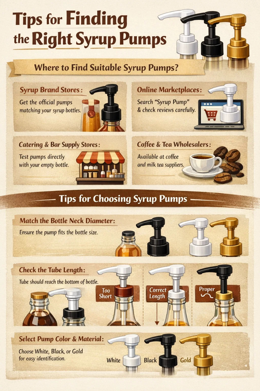 كيفية العثور عليها: الطريقة الأكثر أمانًا هي التحقق من ماركة الشراب الذي لديك. تمتلك معظم ماركات الشراب المعروفة (مثل العلامات التجارية الكبرى لشراب القهوة) مضخات شراب خاصة بها مصممة خصيصًا.