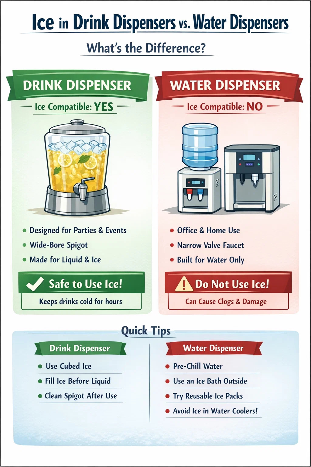 | أفضل نوع ثلج لموزعات المشروبات؟ | الثلج المكعب – أقل احتمالية لسد الحنفية من الثلج المجروش |