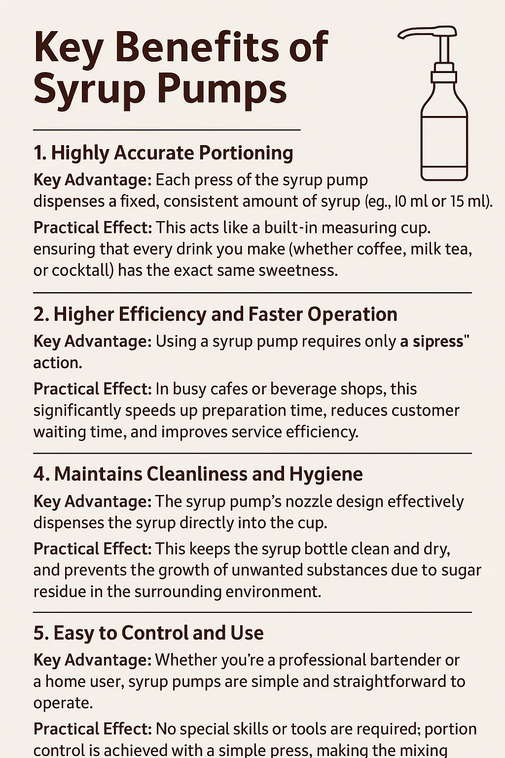 الميزة الرئيسية: كل ضغطة لمضخة الشراب توزع كمية ثابتة وثابتة من الشراب (على سبيل المثال، 10 مل أو 15 مل).