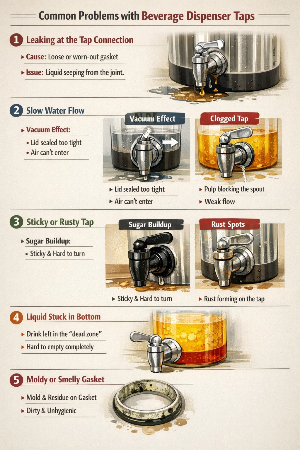بقايا السكر: السكر الموجود في المشروبات، بمجرد تجفيفه، يعمل مثل الغراء، مما يجعل مفتاح صنبور موزع المشروبات المعدني قاسيًا للغاية ويصعب تشغيله.