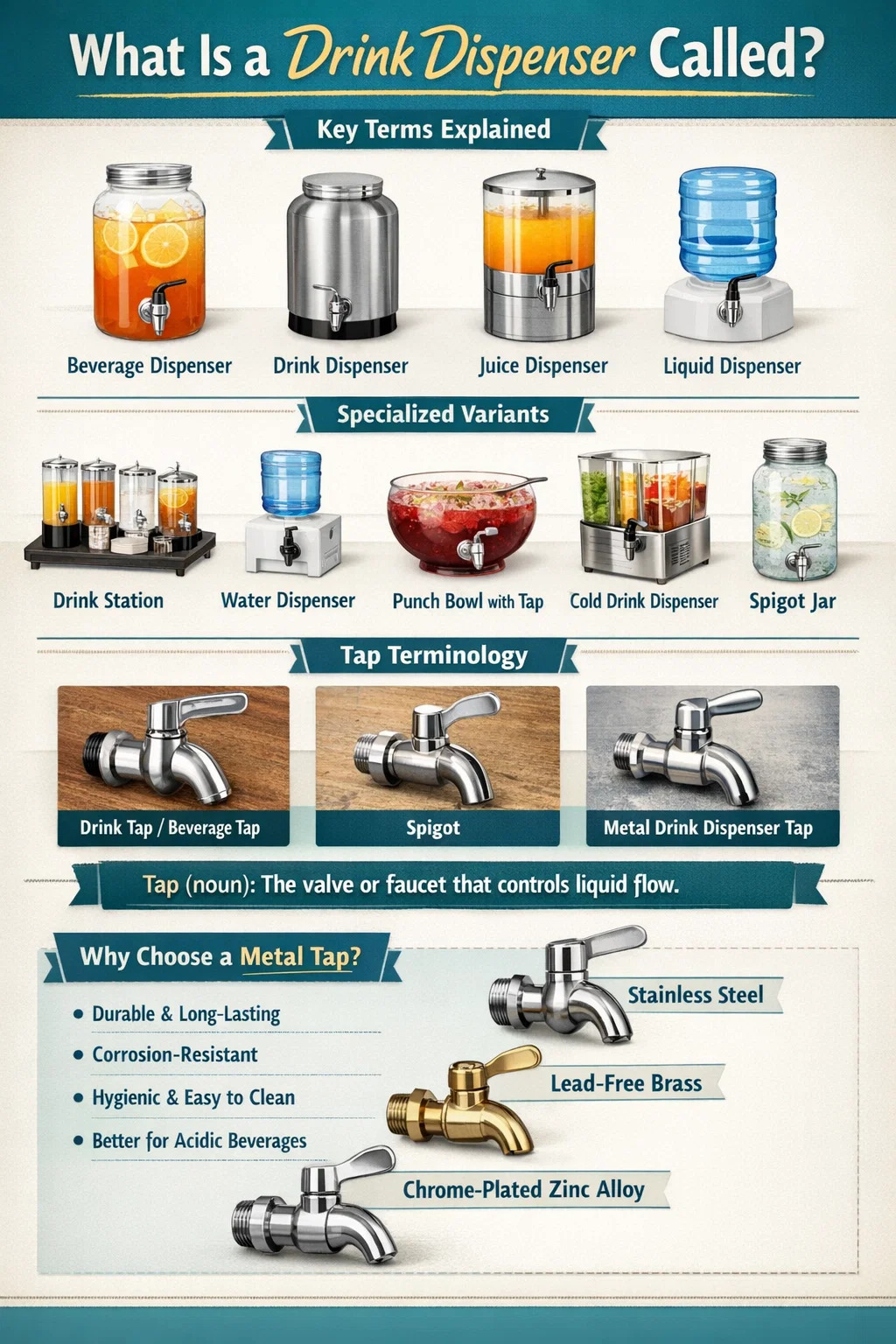 A drink dispenser goes by several names depending on its design, material, and setting. The most common terms include beverage dispenser, drink dispenser, juice dispenser, and liquid dispenser. In commercial and bar settings, the dispensing mechanism itself is specifically called a drink tap, beverage tap, or dispenser tap. When the unit is made from stainless steel or brass, it is typically referred to as a metal drink dispenser tap or metal beverage dispenser faucet.