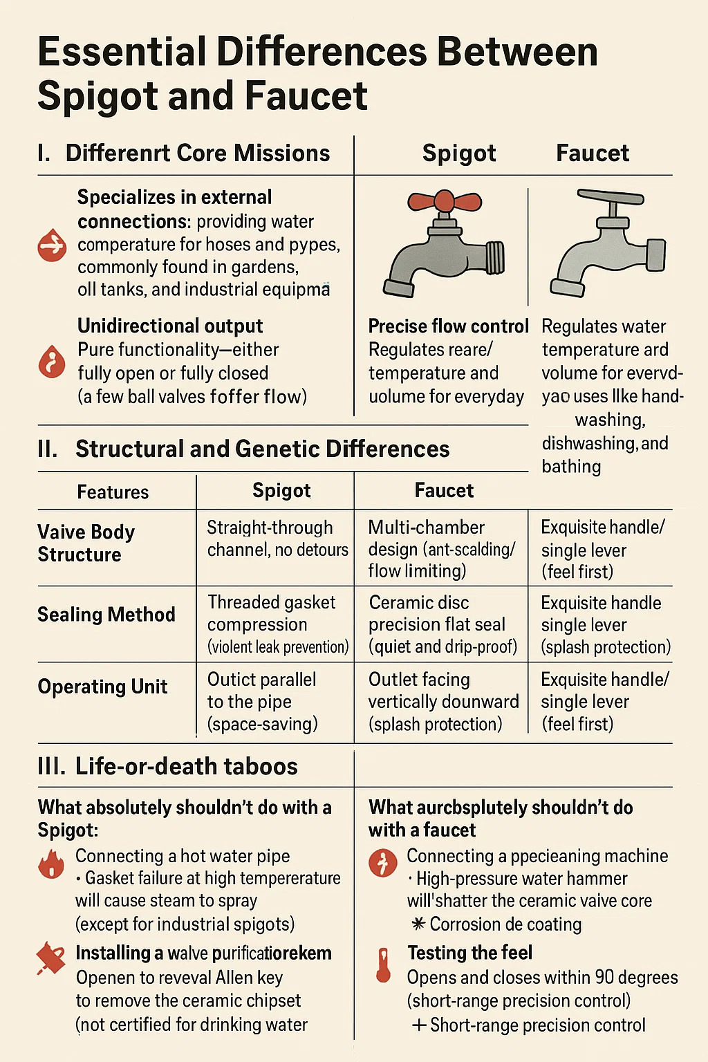ما لا ينبغي عليك فعله مطلقًا باستخدام الحنفية: توصيل أنبوب الماء الساخن ← سيؤدي فشل الحشية في درجات الحرارة المرتفعة إلى رذاذ البخار (باستثناء الحنفيات الصناعية) تركيب نظام تنقية المياه ← هطول المعادن الثقيلة (غير معتمد لمياه الشرب)